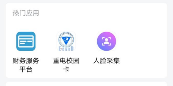 2.2热门应用,包括财务服务平台、重电校园卡、人脸采集等应用。