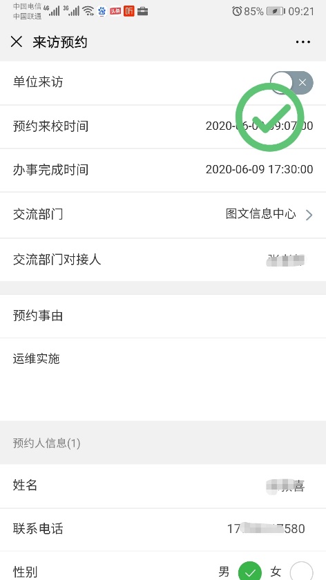 5. 填写需要查询的信息点击查询按钮跳转显示预约信息。若右上角为绿色通行此预约申请已通过。
