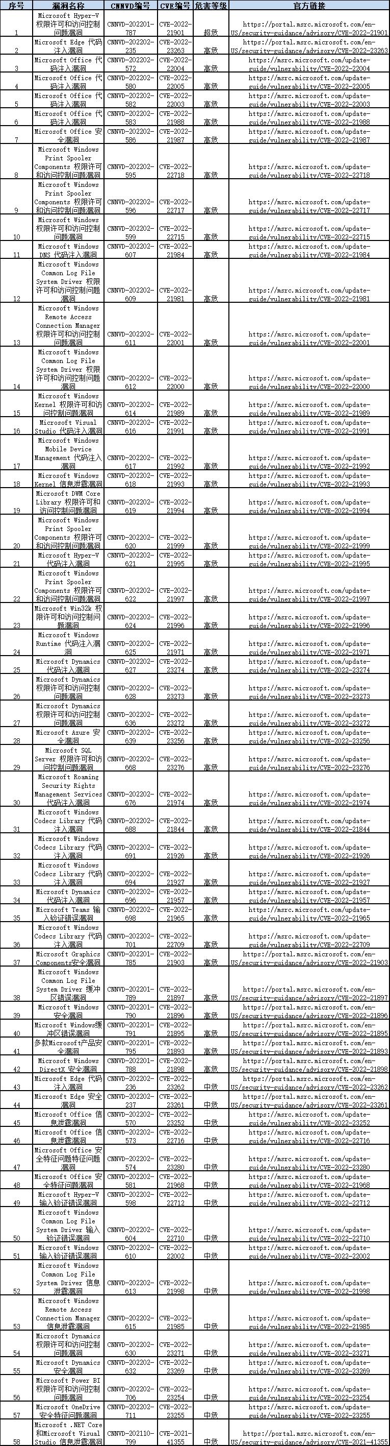 2022年2月8日,微软发布了2022年2月份安全更新,共58个漏洞的补丁程序,CNNVD对这些漏洞进行了收录。本次更新主要涵盖了Microsoft Windows 和 Windows 组件、Microsoft Edge、Microsoft Hyper-V、Microsoft Windows Print Spooler Components、Microsoft Visual Studio、Microsoft OneDrive等。CNNVD对其危害等级进行了评价,其中超危漏洞1个,高危漏洞41个,中危漏洞16个。微软多个产品和系统版本受漏洞影响,具体影响范围可访问https://portal.msrc.microsoft.com/zh-cn/security-guidance查询。