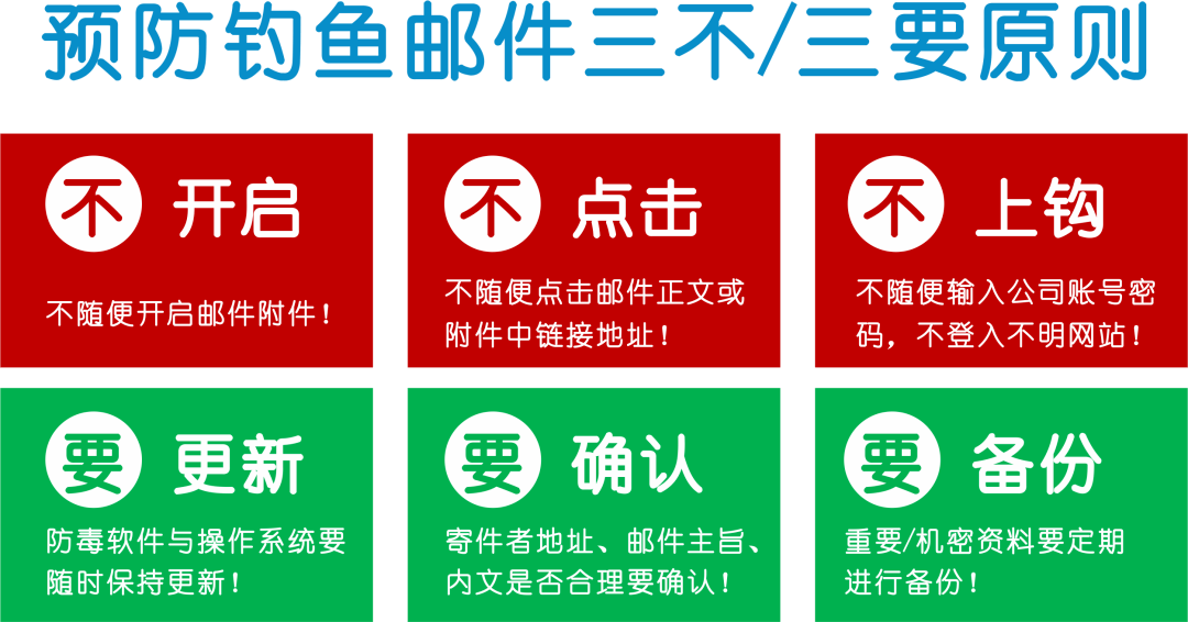 总而言之,为了识别和防止钓鱼邮件,我们要遵循“三不/三要”原则: