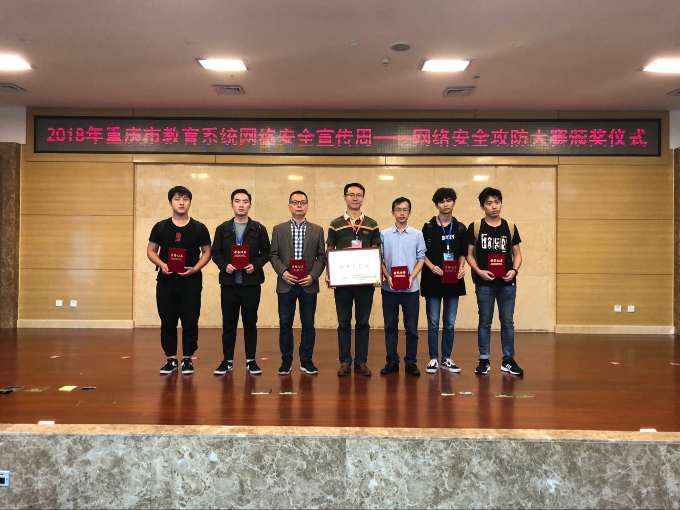 此次决赛是从全市1715人574支战队经初赛选拔出来的20支战队进行现场网络安全攻防比赛。我校由图文信息中心书记、信息管理服务中心主任朱强带领人工智能与大数据学院鲁先志老师、李明建和刘勇雪同学组成的枫雪战队以及胡兵老师、2名杨鑫同学组成的0&1战队参加了此次决赛。经过两个小时激烈角逐,大赛最终产生5个一等奖战队、7个二等奖战队、7个三等奖战队。我校鲁先志老师领衔的枫雪战队喜获一等奖,胡兵老师领衔的0&1战队荣获二等奖。此外,万州区教育委员会、璧山区教育委员会、重庆大学、重庆师范大学、重庆邮电大学、重庆理工大学和我校等10个单位荣获2018年全市教育系统网络安全攻防竞赛优秀组织奖。