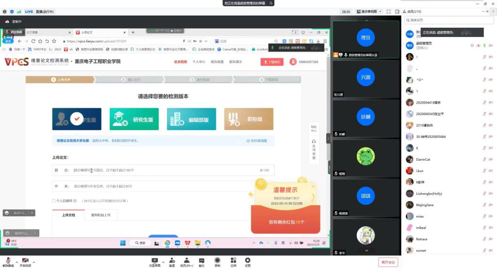2023年3月31日15:00,图书馆联合重庆维普资讯有限公司开展了以“毕业论文写作与维普论文查重系统的使用”为主题的线上专题讲座,为同学们的毕业论文(设计)写作排疑解惑,本次讲座共有二百余名学生参与。