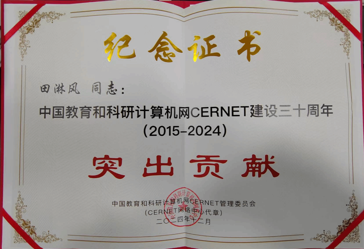 学校依托CERNET培育省部级科技进步奖、科研项目、发明专利、重庆市网信工作先进个人等多项成果;凭借持续深耕CERNET建设,我校田淋风老师获评“CERNET建设30周年突出贡献个人”荣誉称号,此殊荣全国职业院校教师仅5人,西南地区唯一1人。